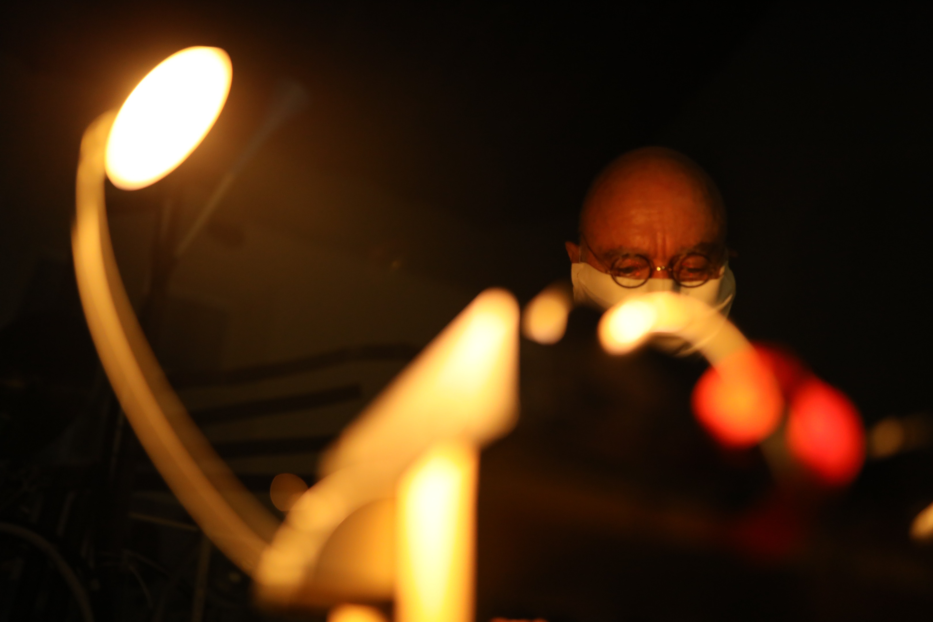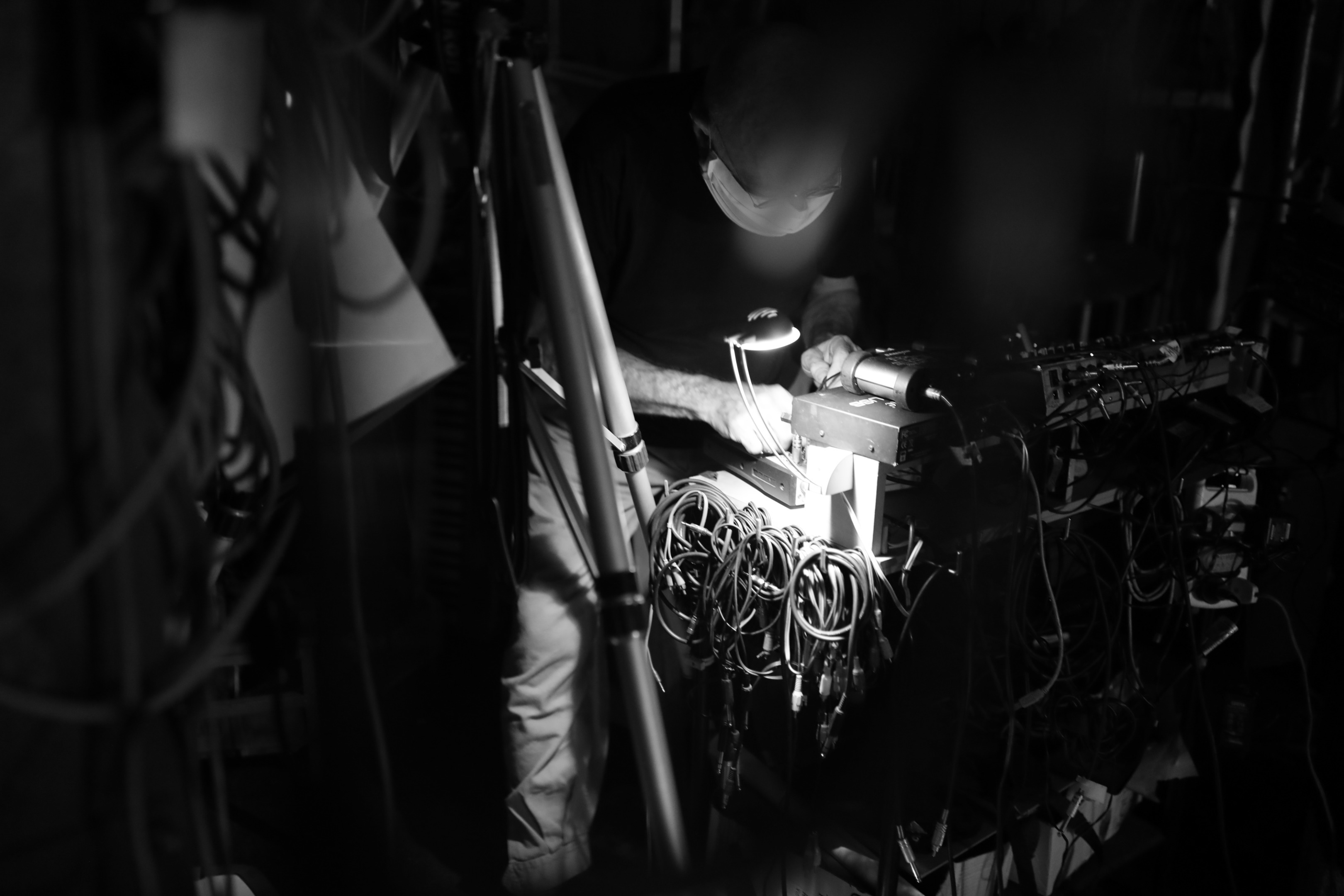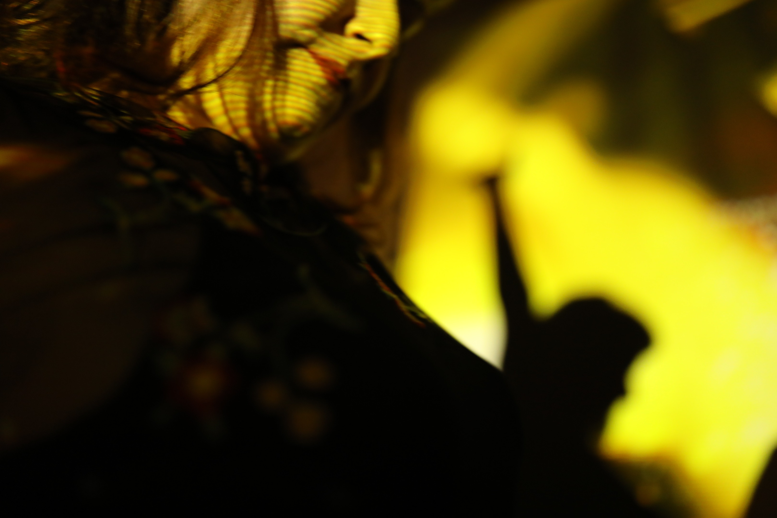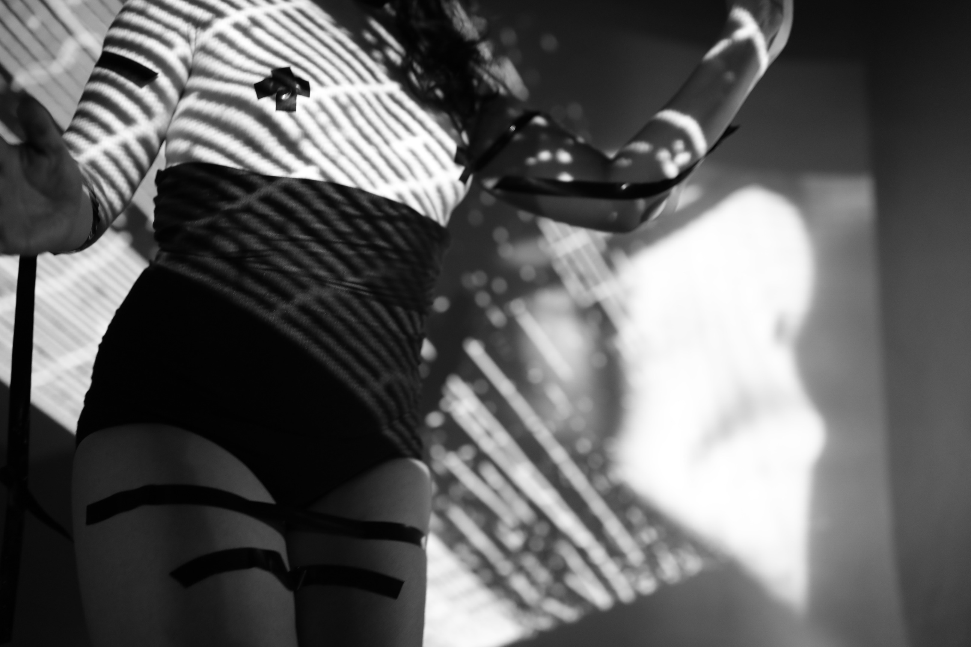 En la obra trabajamos con fotografía, video intervenido y proyectado en vivo, performance y música electroacústica, teniendo como resultado una escena que se va actualizando y retroalimentando visualmente por lo que va sucediendo.